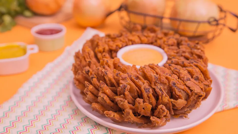 - Frite a cebola em imersão até que fique dourada;